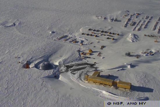 View of the South Pole station in Novmeber 2002. Note the snow drifts around the buildings.
