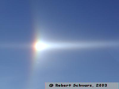 The parhelion or sundog. Note the rainbow colors due to dispersion in the ice crystals.
