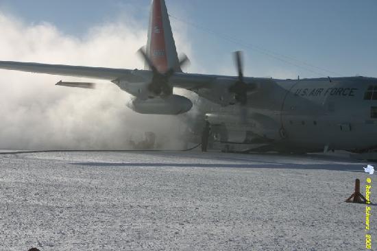 Contrail behind the plane, it is still too cold to load the planes with the heavy equipment so all the bags have to be loaded by hand.