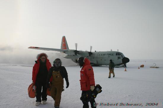 It is still so cold that the exhaust of the engines create a contrail right behind the plane.