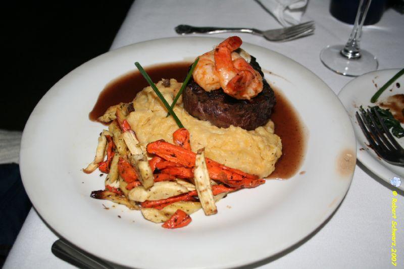 Grilled Beef Tenderloin served w/ shrimp Russet and sweet potato mash with Root vegetables and a Gorgonzola butter